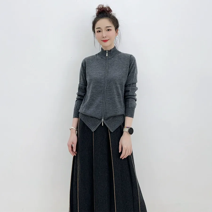 autumn new double zipper long sleeved temperament knitted cardigan comfortable and casual fine spun wool knitted sweater for women